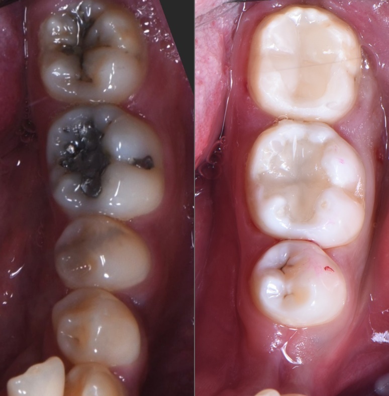 검게 썩어있던 깊은 충치는 깔끔하게 제거되었고, 특수 fiber를 이용한 레진빌드업으로 치아의 형태가 완벽하게 재건되었습니다.